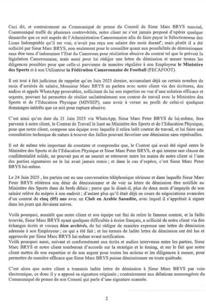 À en croire les avocats de Clément Eboué, contrairement à ce qu’affirme le communiqué du conseil de Marc Brys, leur client n’a fait l’objet d’aucune poursuite judiciaire jusqu’à date. Ils ont tenu à démentir formellement tout prétexte de piratage évoqué par le patron de la sélection camerounaise de football dans cette affaire. Ils révèlent également que selon les clauses de confidentialités du contrat qui lie le Minsep au coach, leur client ne pourrait y avoir accès si ce n’est l’une des parties qui le lui remettait. Et il lui a été envoyé par le sélectionneur lui-même le 21 juin 2025 via WhatsApp.
