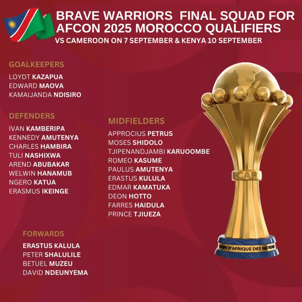 La liste des joueurs de la Namibie pour les deux premières journées des éliminatoires de la CAN 2025 est connue. Le sélectionneur des Brave Warriors, Collin Benjamin, a publié l’identité des guerriers qui vont défier le Cameroun et le Kenya pour cette entame de la campagne qualificative.