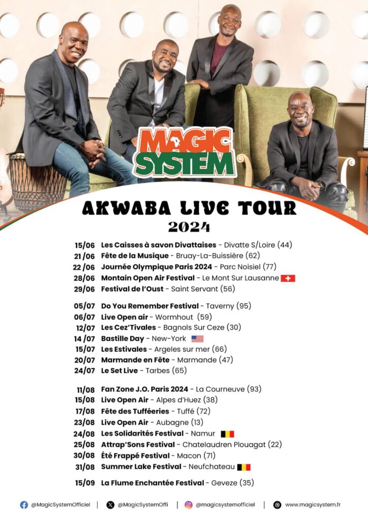 Ainsi, les quatre gaous magiciens s’apprêtent à s’envoler zougloutiquement à travers le monde avec une tournée baptisée ‘’Akwaba Live Tour 2024’’, en hommage à l’hymne officiel de la CAN 2023 qui a vu le sacre des Pachydermes ivoiriens. C’est le lead-vocal du groupe, A’Salfo qui a donné la bonne nouvelle le dimanche 2 juin sur sa page Facebook en publiant l’affiche de la tournée accompagnée d’une publication. ‘’Après un hymne de la CAN 2023 avec à la clé la victoire des Éléphants de Côte d’Ivoire, un FEMUA 16 soldé par un retentissant succès, place maintenant à l’ »Akwaba Live Tour 2024”. Prenez vos calepins pour 4 mois de tournée non-stop’’, écrit-il. Cette tournée musicale de Magic System démarre en France le samedi 15 juin prochain et va conduire le groupe jusqu’au mois de septembre prochain en Suisse, Allemagne et aux Etats-Unis.