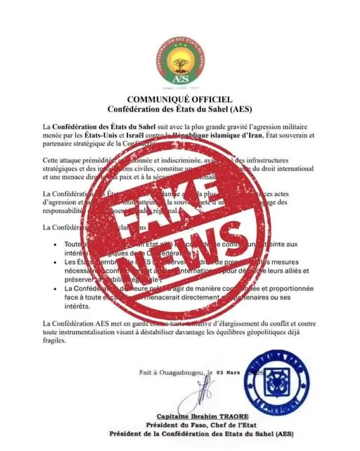 Mardi 3 mars, un communiqué portant le logo de l’AES et la prétendue signature du Président burkinabè a fait le tour des réseaux sociaux. Selon les auteurs des publications, il s’agirait d’un communiqué qui expose la position de l’AES à propos des frappes meurtrières en Iran. Le faux communiqué indique que l’AES condamne les frappes israélo-américaines et dénonce une menace sur la paix. L’AES aurait clairement pris position pour l’Iran que le communiqué qualifie « d’État ami ».