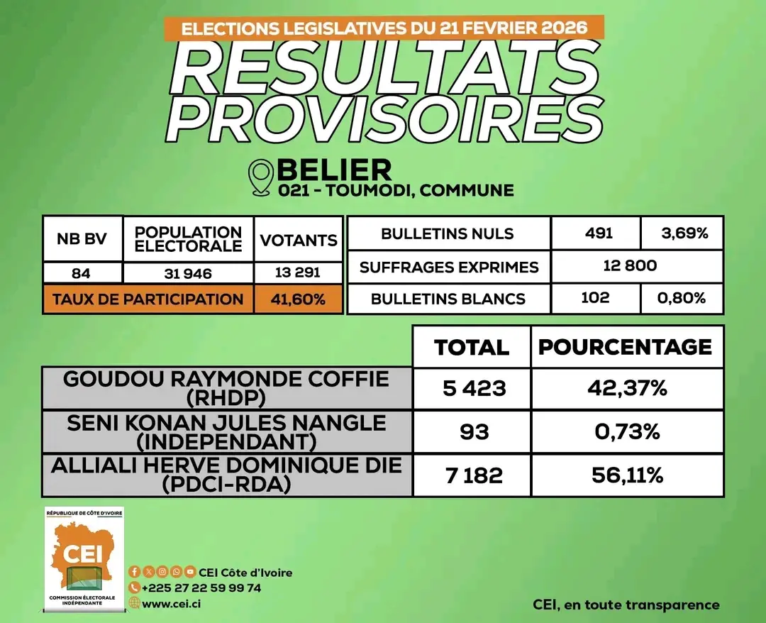Selon les résultats provisoires de la Commission électorale indépendante et du Conseil constitutionnel, le candidat Hervé Alliali est sorti vainqueur des élections partielles à Toumodi. Il a largement gagné devant Raymonde Goudou Coffie du RHDP.