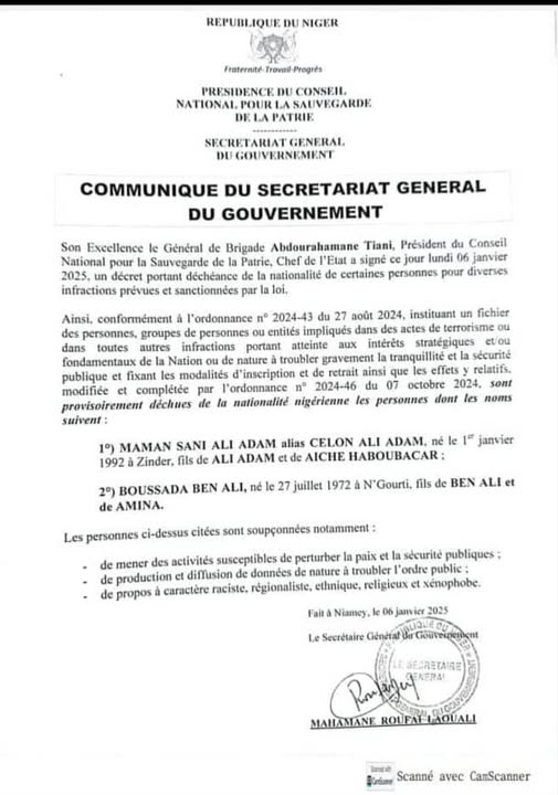 Cette nouvelle décision s’appuie sur une série de textes de loi adoptés depuis le coup d’État, notamment l’ordonnance du 27 août 2024 qui permet de retirer la nationalité nigérienne à toute personne considérée comme une menace pour la sécurité de l’État du Niger.